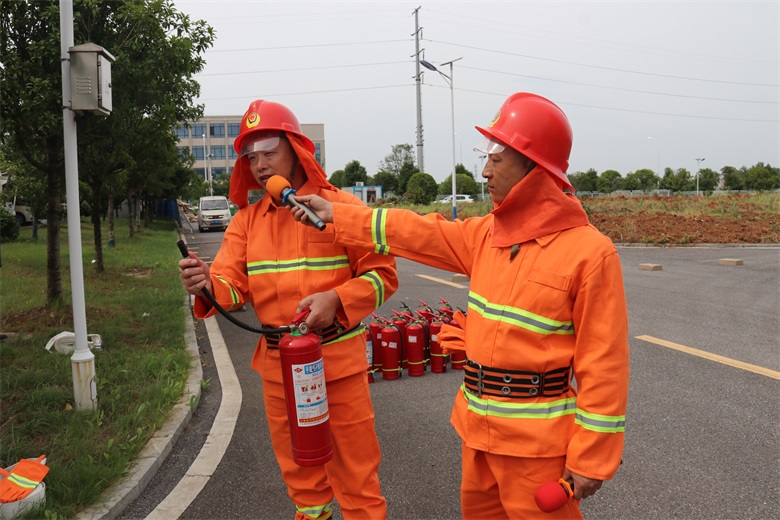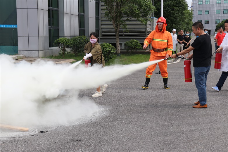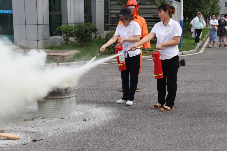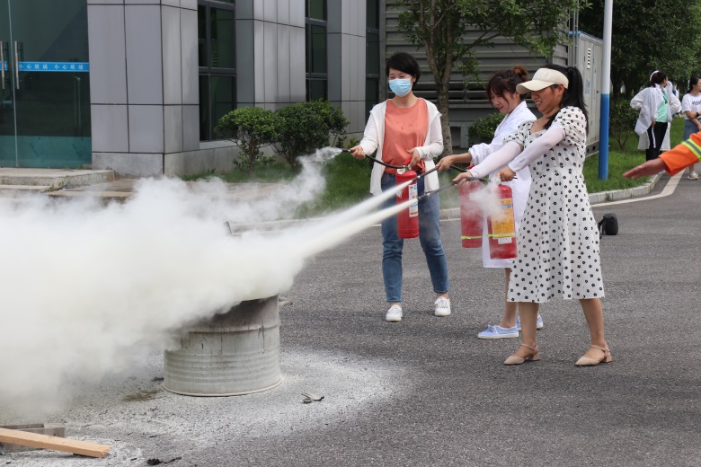 活动当日,应急预案演练小组组织了消防演练活动,模拟火灾现场,各部门负责人组织员工进行有序的安全疏散逃生。随后,工程基建主管王志红向员工讲述了办公区域火灾的危险性及常见的隐患,并向参加演练的员工详细讲解了灭火技巧和灭火器材的操作方法。培训过后,员工分批上前进行紧急救援实际操作,拎起灭火器来到火盆前3米上风位置,拔下保险插销、对准火苗根部,用力按压手柄,喷出干粉瞬间覆盖燃烧区域,火焰逐渐熄灭。